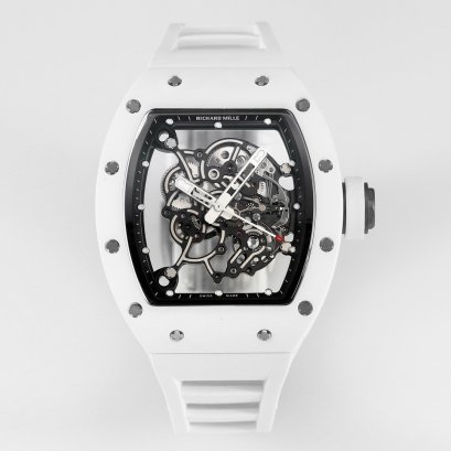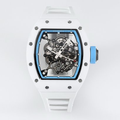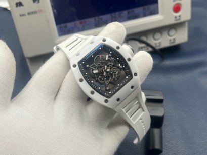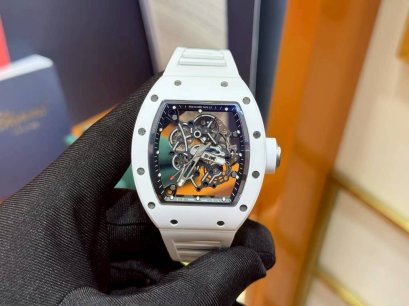 ZF Factory – Richard Mille RM055 Ceramic หนึ่งในรุ่น “ที่สุด” ของ ZF Factory ที่ถูกยกให้เป็นระดับตำนาน ทั้งในด้านตัวเรือนและกลไก • ตัวเรือนระดับตำนาน (Legendary Case) • ขนาด 49.90 x 42.70 มม. • ผลิตจาก เซรามิกน้ำหนักเบา ผ่านการควบคุมอัตโนมัติแบบพิเศษ • หน้าและหลังใช้กระจกแซฟไฟร์เจียรนัยคุณภาพสูง • สวมใส่สบาย เบา ทนทาน จนได้ฉายา “F1 บนข้อมือ” • กลไกระดับตำนาน (Legendary Movement) • กลไก Caliber RMUL2 ขึ้นลานมือ แบบ Skeleton • ผลิตจากไทเทเนียมเกรด 5 พร้อม PVD coating และ Titalyt treatment • โครงสร้างแข็งแรงสูงสุด พื้นผิวชิ้นส่วนเรียบเนียน • ระบบเฟืองทำงานสมบูรณ์แบบเทียบแท้ • มีระบบ Barrel ปรับความตึงลานได้, กันกระแทก, เดินแม่นยำและเสถียรสูง • ทุกชิ้นส่วนสามารถถอดเปลี่ยนกับของแท้ได้ (1:1)