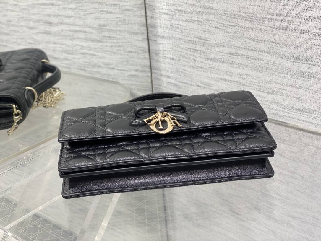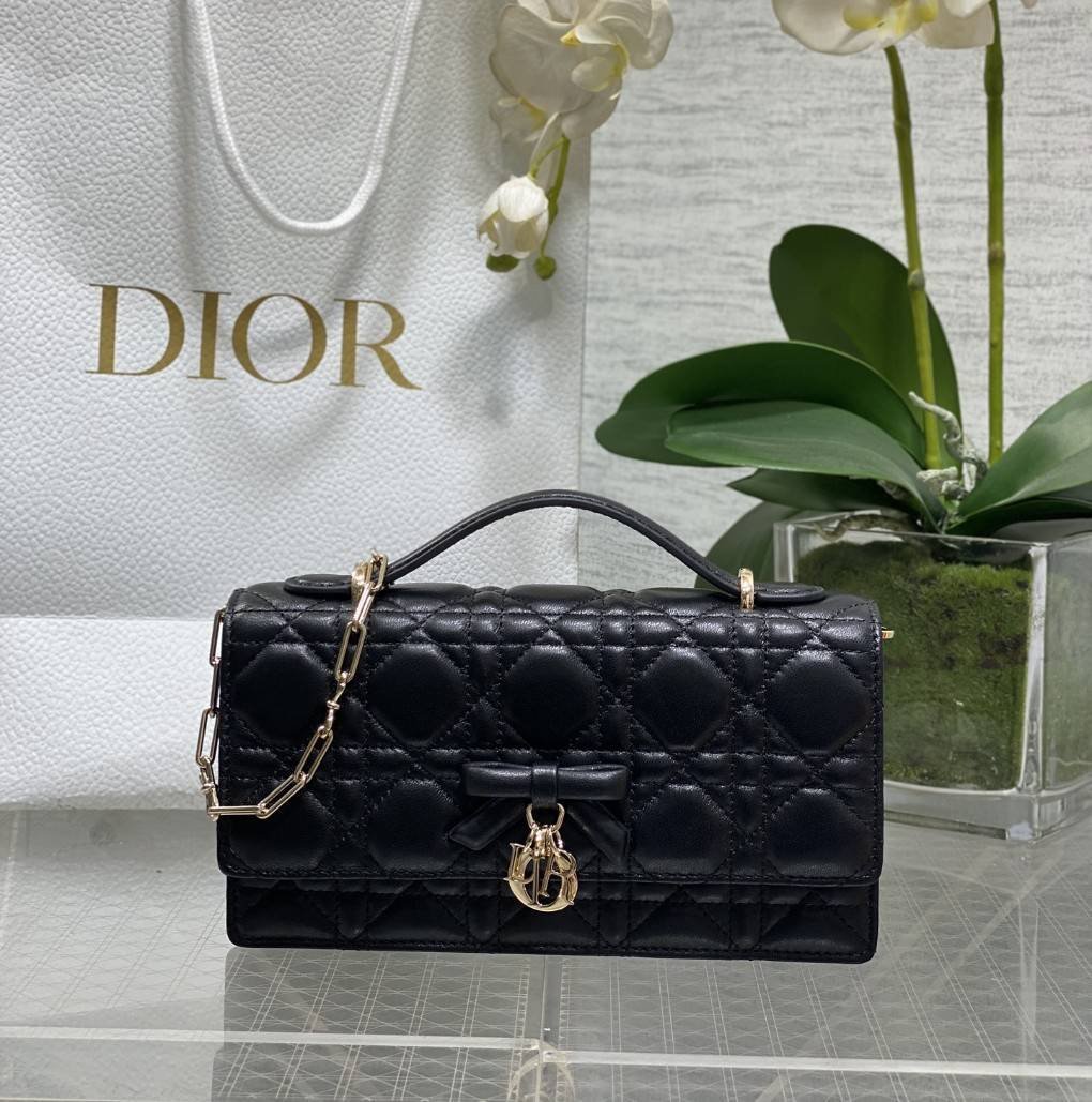 MINI MY DIOR BAG พร้อมส่ง ✨️กระเป๋า Dior My Dior ขนาดมินิ ดีไซน์หรูจากหนังแกะลาย Cannage สีดำ ตกแต่งโบว์และจี้ D.I.O.R. โลหะด้านหน้า ภายในมี 2 ช่องหลัก ช่องหลัง และช่องใส่บัตร 3 ช่อง ใช้งานได้ทั้งกลางวันกลางคืน มาพร้อมหูจับและสายโซ่ถอดได้ สะพายหรือถือได้ ขนาด: 21 x 11.5 x 4.5 ซม.